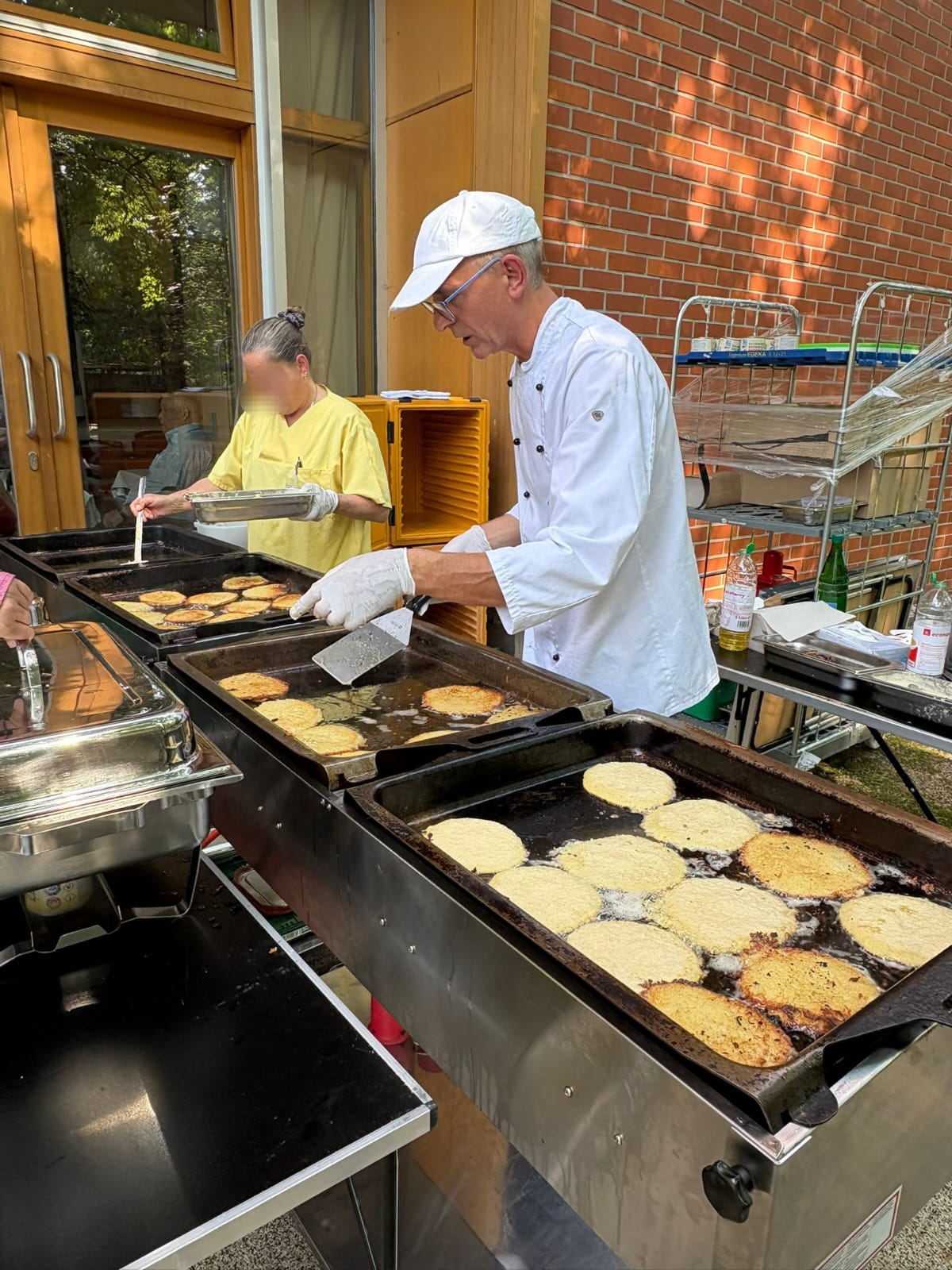 Wie in jedem Jahr konnten wir auch diesmal unser traditionelles Kartoffelpufferessen genießen. Dieses Mal spielte sogar das Wetter mit, denn strahlender Sonnenschein und angenehme Temperaturen luden dazu ein, die frisch gebackenen Kartoffelpuffer sowohl drinnen als auch draußen zu genießen. Unser Küchenchef und seine Helferin bereiteten die Leckereien mit viel Sorgfalt und Liebe zum Detail zu. Ein schöner Spätsommertag für unsere Bewohnerinnen und Bewohner im Ev. Pflegewohnheim Schönow!