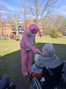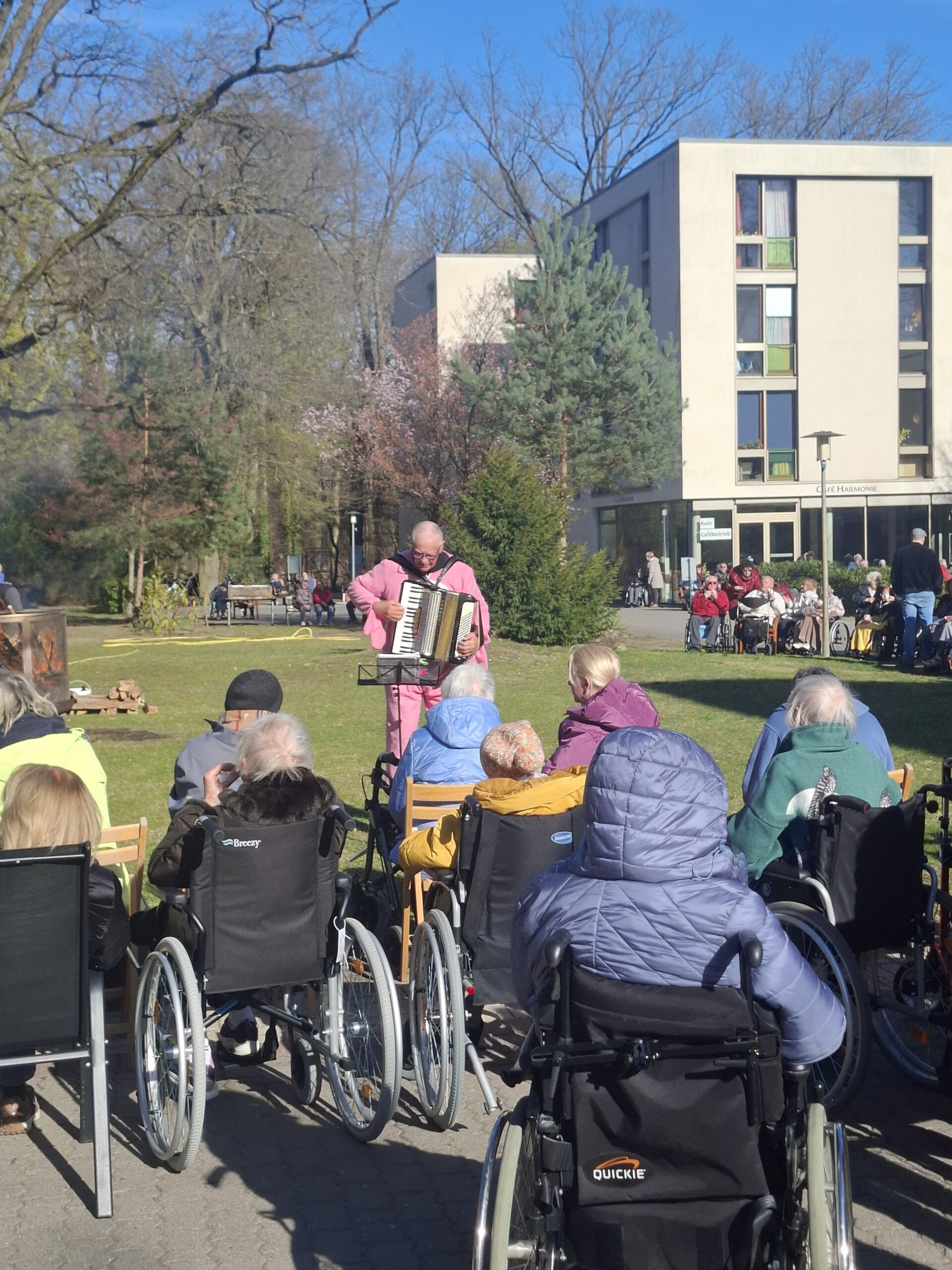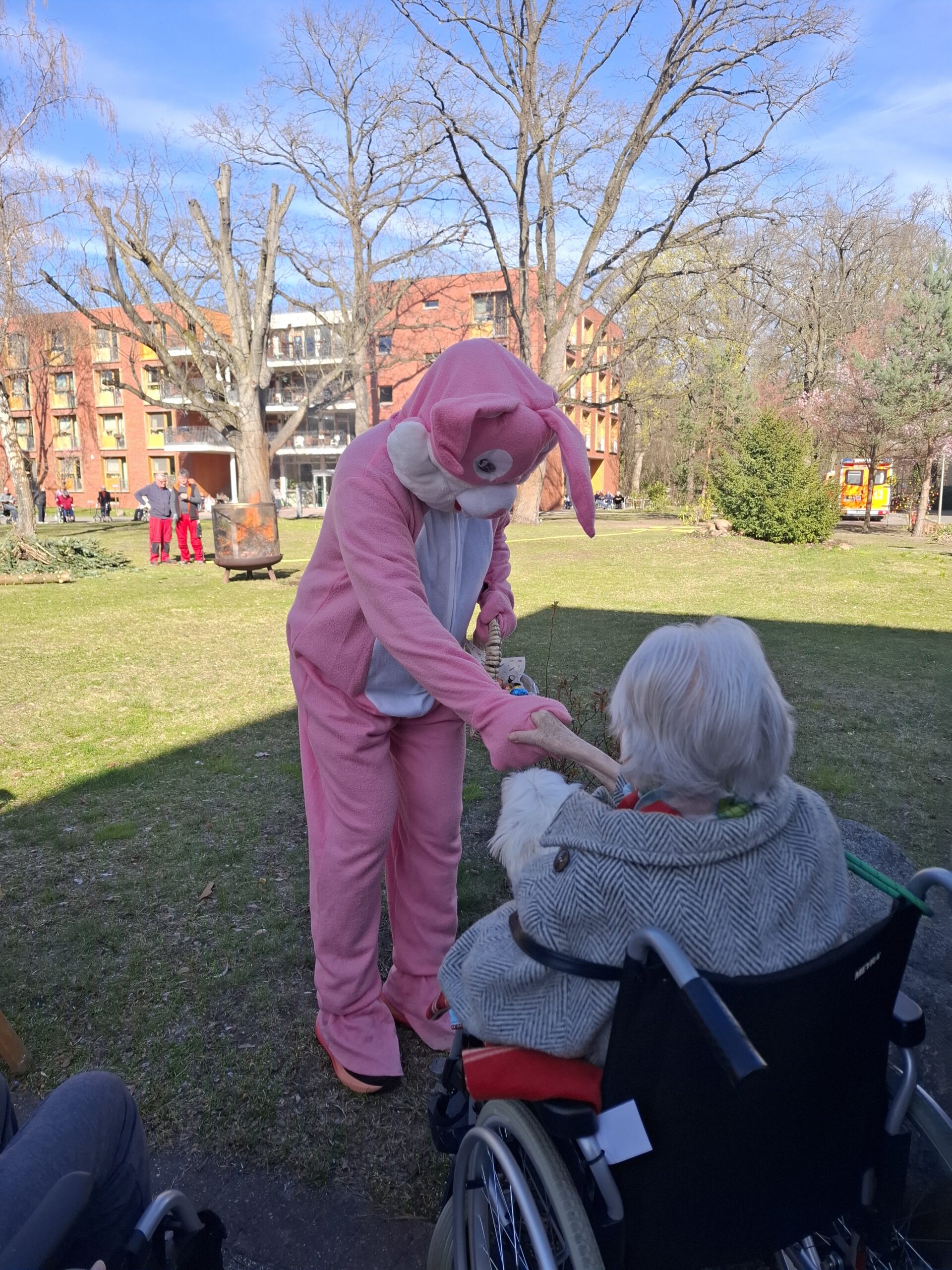 Am Karsamstag, den 04.04.2026, haben wir bei frühlingshaften Temperaturen auf dem Gelände Schönow unser Osterfeuer gefeiert und damit den Start in die neue Jahreszeit eingeläutet. Für besondere Akzente sorgte der pinke Osterhase, der sich für unsere BewohnerInnen und BesucherInnen Zeit nahm und süße Überraschungen verschenkte. Mit seinem Akkordeon brachte er zusätzlich Schwung in das Fest. Es entwickelte sich ein rundum gelungener Nachmittag, der von Musik, guten Gesprächen und geselligem Beisammensein geprägt war.